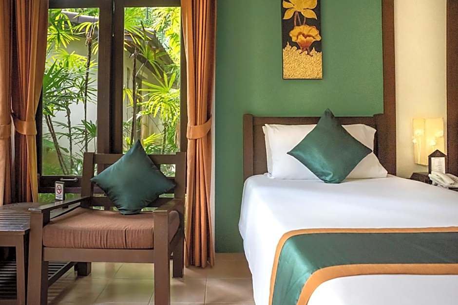 Large air-conditioned villa features a private balcony with garden views.